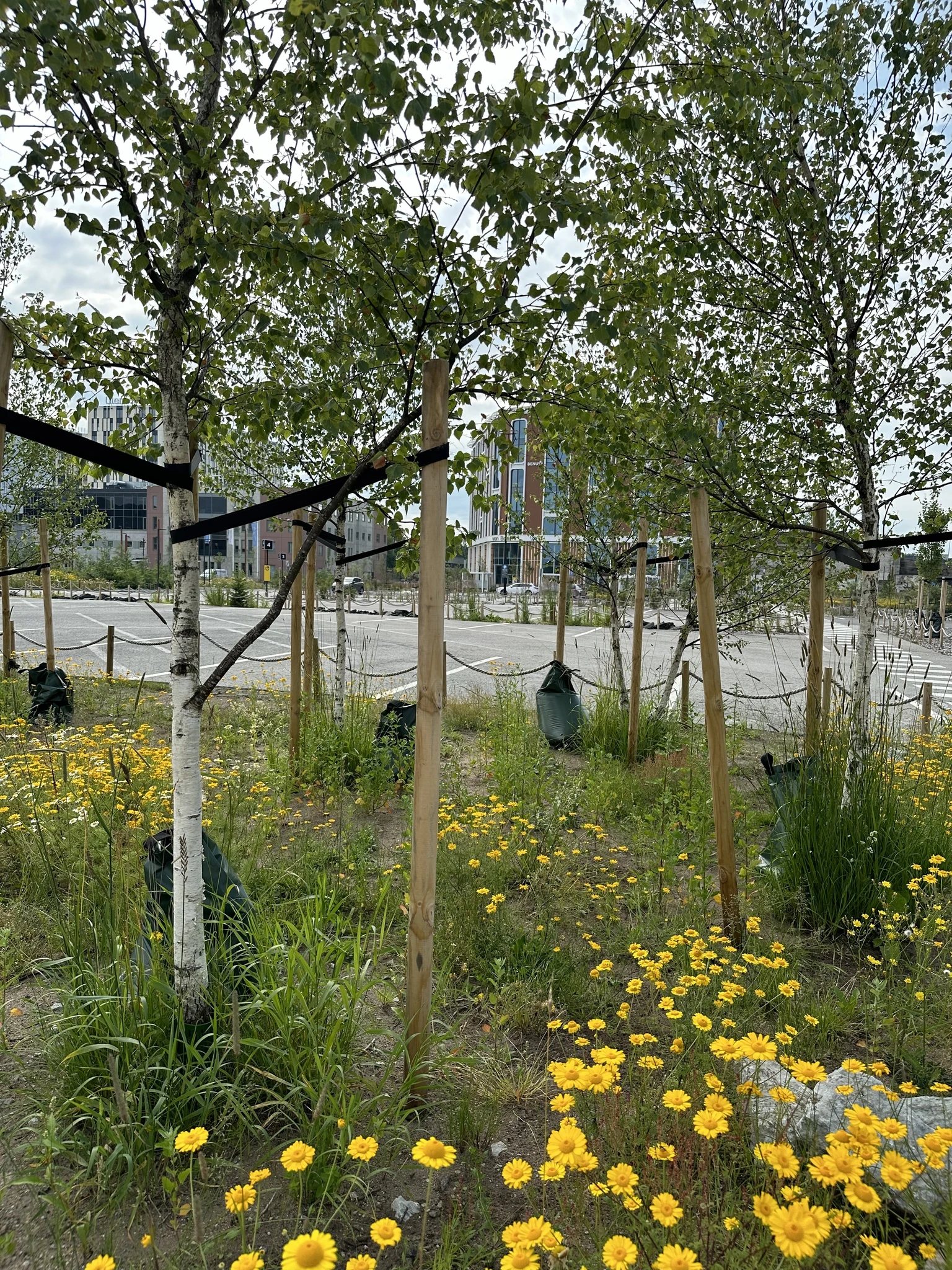 Ülemiste City on pidevas arengus ning sellest lähtuvalt vajas tellija kiiresti parklaala suurendamist, mis tulevikus järk-järgult hooneid täis ehitatakse. Tellija soovist rohelust parklasse tuua vormus maastikuarhitekti initsiatiivil ajutise haljastuse kontseptsioon, mis kasutab ära kohalikest puukoolidest pärit standarditele mittevastavaid ja põllule kasvama jäänud istikuid. Idee on anda neile uus elu ja potentsiaal, et järgnevatel aastatel pärast jälgimist ja hooldust istutada tugevamad ümber Ülemiste tulevikuarendustesse. Istikud käis maastikuarhitekt isiklikult puukoolidest otsimas ja välja valimas. Lisaks puittaimedele täiendasime parkla haljastust kõrgete püsikutega (kõrrelised ja püsililled) ning külvati ka niidumuru seeme, eesmärgiks õied, mis paistaks silma üle autode ninade. Tulemuseks sai üsna tavatult lopsakas kombinatsioon taimi muidu nii üheülbalises parklas. Lahendus arvestab ka muus materiaalsuses taaskasutuse printsiipe - alale nägime ette kasutada kohapealsete katendite materjale ja lammutusjäätmeid. Osa olemasolevast asfaldist säilis, aga imbalade rajamiseks ja uue vajaliku vertikaali loomiseks ülesvõetud asfaldist tekkisid maastikuarhitekti ja rajaja koostöös kompositsioonid parkla vettkoguvatele haljasaladele. Parklakohtade puhveralad on enamuses vihmavee kogumiseks ja taimmaterjali valikul sellega ka arvestati. Projekt arvestas naaberkinnistu Sepapaja 12 tervisemaja maastikuarhitektuurse lahendusega (Tajuruum OÜ) ja püüdis lähtuda ka selles projektis kasutatud taimmaterjalist.